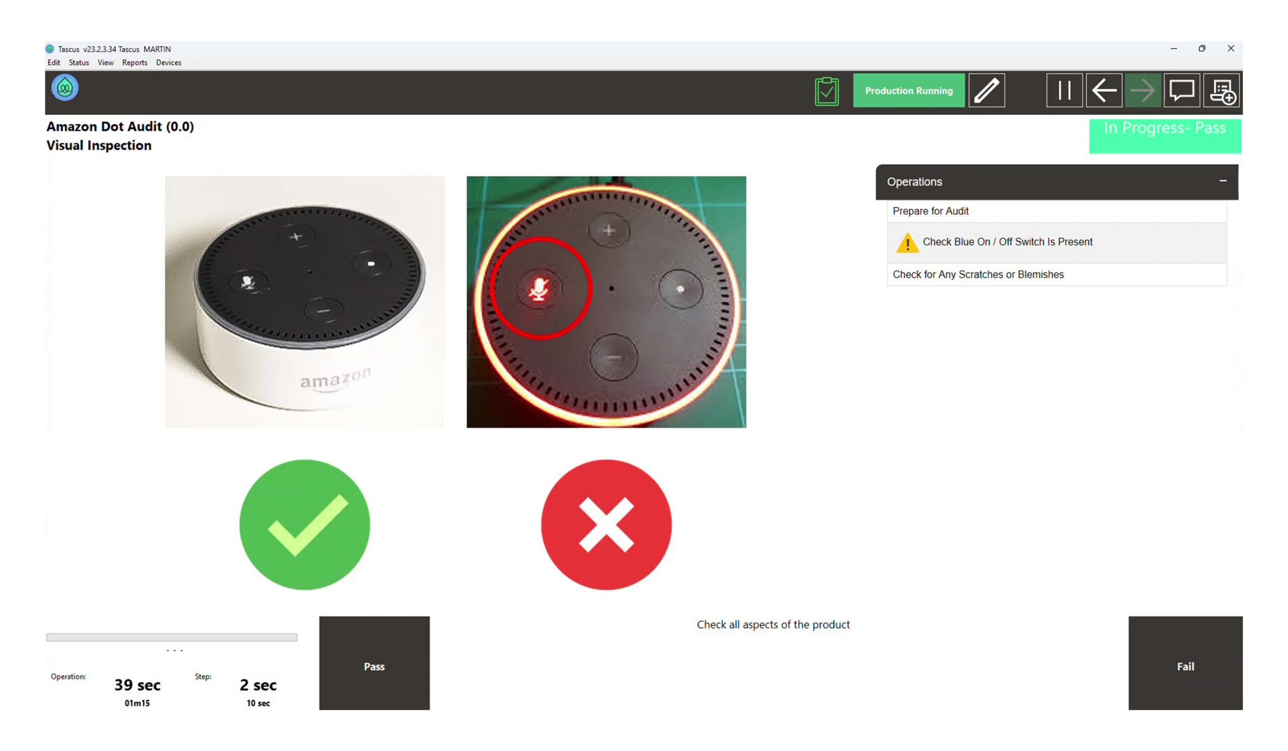 Tascus runs at the production workstation. It guides the operator through each step in the correct sequence, embeds checks directly into the process, and prevents the job moving forward until requirements are met.